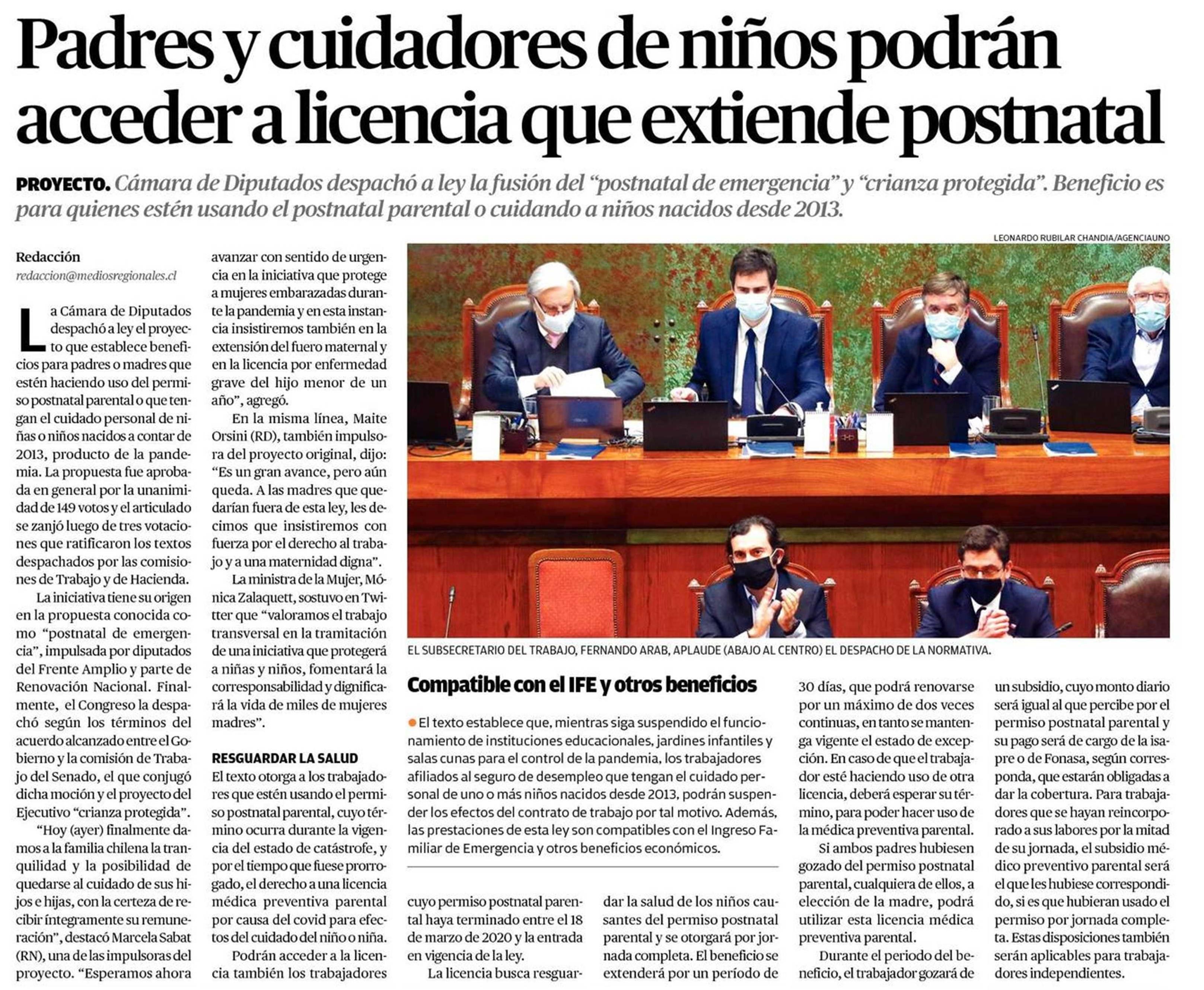 Inicio ultimas noticias pais postnatal de emergencia: Gobierno y congreso acuerdan tres meses de licencia médica. Y del trabajo, patricio melero, promulgó la ley de extensión del postnatal de emergencia. En la tarde de ayer, por unanimidad, la sala del senado logró aprobar en general el proyecto que permitirá la extensión de la licencia de postnatal para la iniciativa, surgida tras un acuerdo entre el gobierno y la comisión de trabajo del senado a raíz del proyecto de postnatal de emergencia. Este proyecto pretende beneficiar a 850.000 madres, padres o cuidadores de niños menores de 6 años.